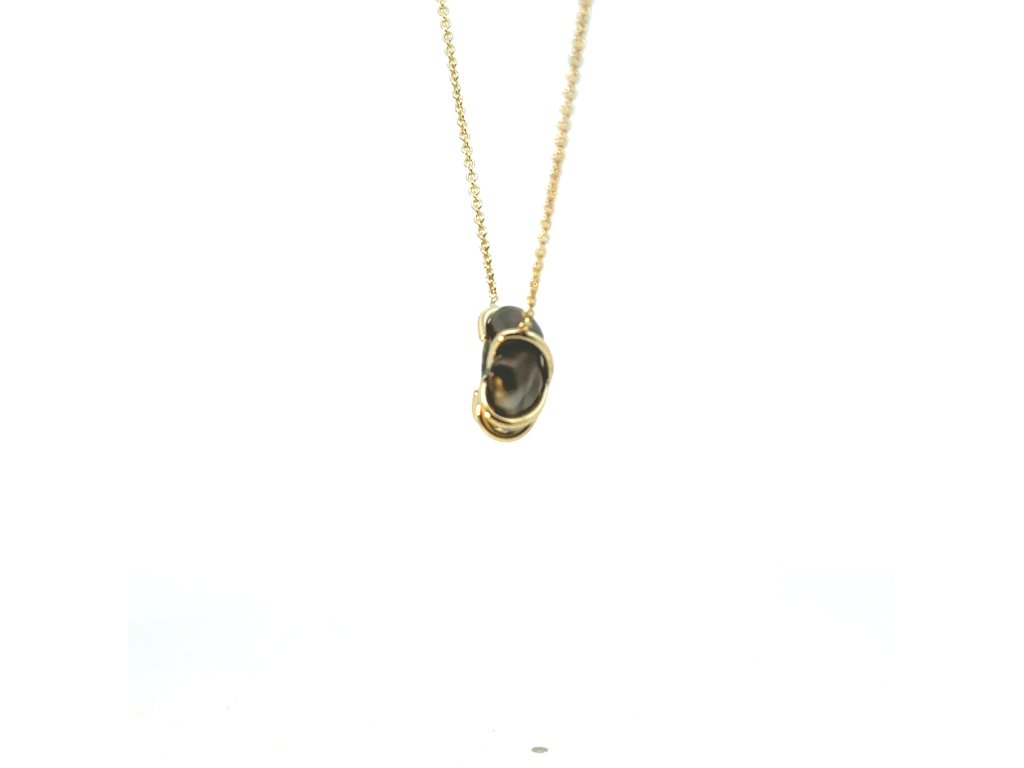 V srdci tohoto výjímečného šperku se ukrývá perla keshi z Tahiti - drobný zázrak, který vznikl bez zásahu člověka, pouze z čisté perleti. Její tvary nejsou pravidelné, ale právě tím působí jako dar moře - volný, nezkrotný, přesto vzácný. Křížení jemných drátků ze žlutého zlata ji objímá s lehkostí, která respektuje její jedinečný tvar.