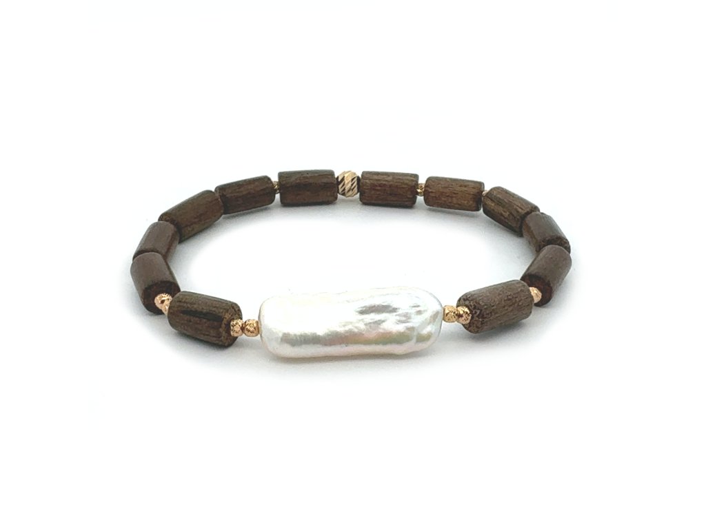 Náramek biwa perla a tropické dřevo se zlatými komponenty Dárková krabička i certifikát o pravosti perly zdarma