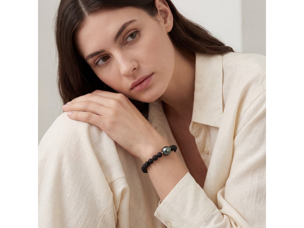 Matný černý onyx vytváří sofistikovaný základ a přirozeně zvýrazňuje to nejcennější - pravou mořské perle z Tahiti. Kontrast syté černi a přirozeného lesku působí kultivovaně, moderně a nadčasově.