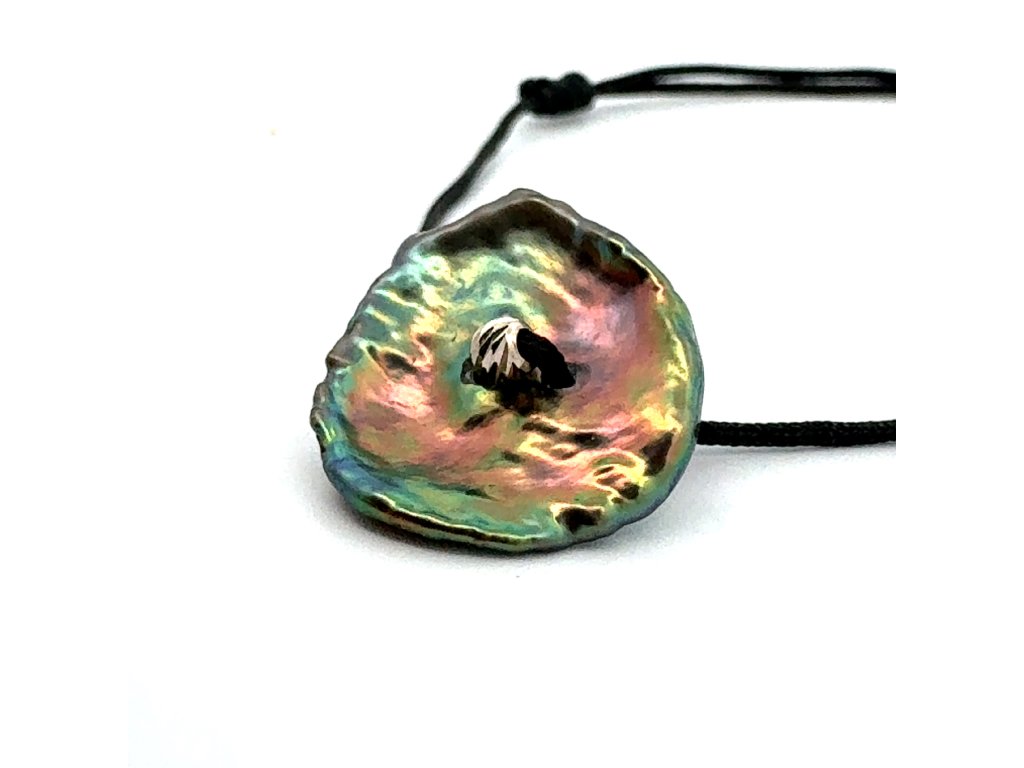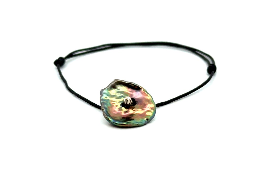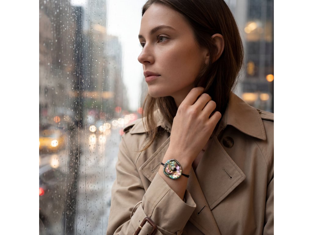 Tento náramek je přesně ten typ, který na ruce nepůsobí jako obyčejná ozdoba, ale jako malý luxusní artefakt. Dominantou je výrazná sladkovodní perla s jedinečnou perleťovou strukturou, která hraje všemi odstíny - od jemně růžové, přes tyrkysovou až po zlatavé tóny. Každý pohyb ruky mění její barvy, jako kdyby na povrchu perlou procházelo světlo.