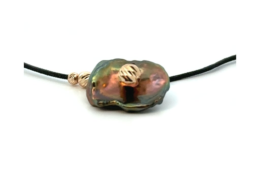 V samotném středu najdete elegantní detail - drobnou kuličku ze žlutého rytého zlata, která působí jako šperk ve šperku. Je jemná, ale nepřehlédnutelná. Díky rytí se v ní odráží všechny odstíny perly. Dvě menší zlaté kuličky zdobí i padákovinu, čímž dává náramku punc luxusu. Právě kontrast - přírodní perla a precizní zlatý prvek dělá z náramku výjimečný a elegantní šperk.