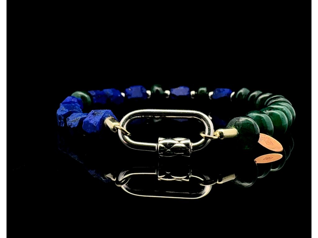 Zelené kolumbijské smaragdy s hedvábným leskem a nezaměnitelnou sytostí barvy se střídají s lapisem nazuli v sytě královské modři. Jejich souhra vytváří působivou hru barev - od jemného odlesku až po hluboký kontrast, který dodává náramku neobyčejnou noblesu a charakter pravého klenotu.