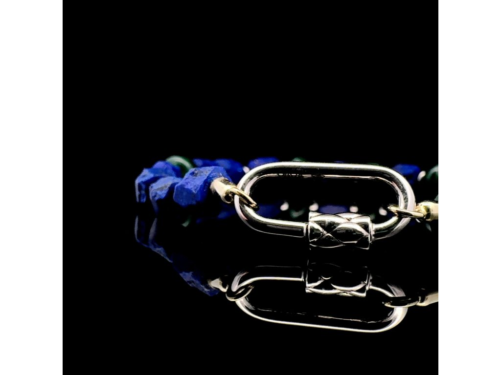 Tento náramek je mistrovským spojením dvou nejvzácnějších drahokamů. Hluboká zelená kolumbijských smaragdů - považovaných za nejcennější na světě - kontrastuje s královskou modří lapisu nazuli z afghánských nalezišť, kamenem ceněným od dob starověkých faraonů.