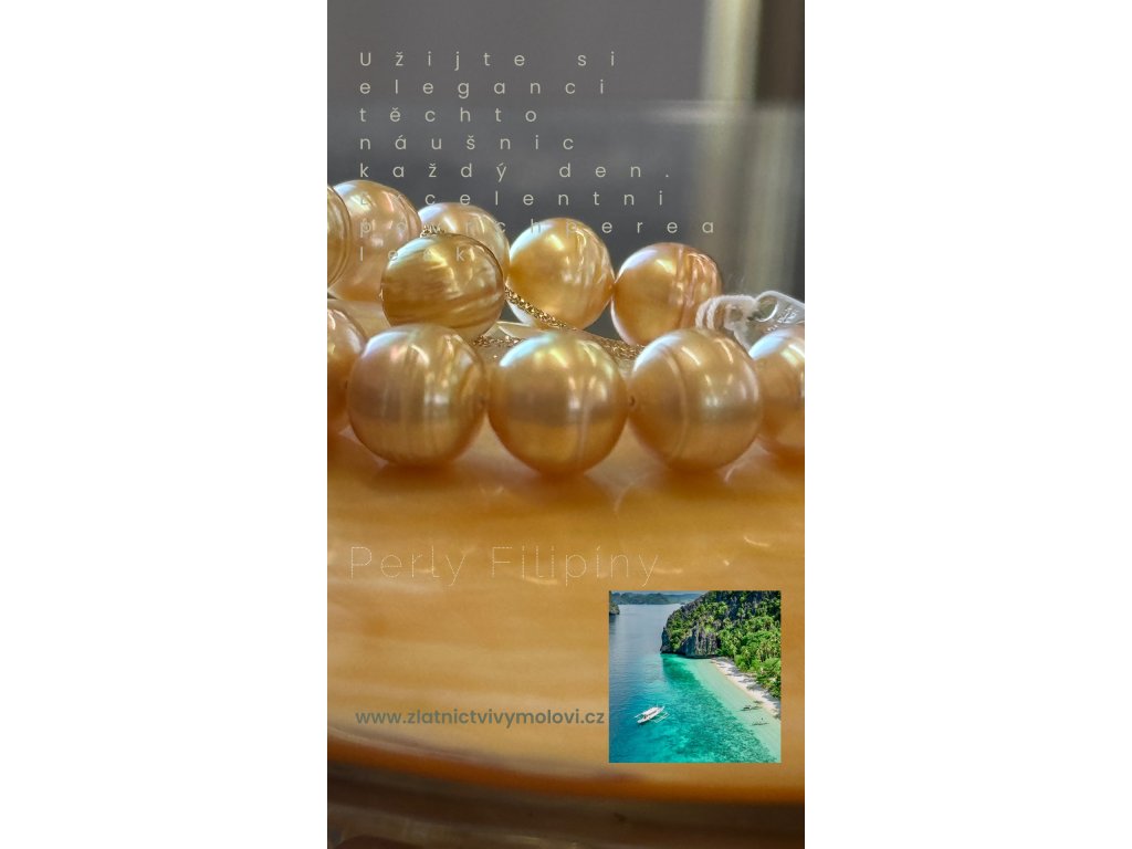 Zlaté perly z Filipín - říká se jim často 24k gold of the ocean - s velikostí 10,4 - 10,7 mm patří mezi nejvzácnější poklady moře. Jejich přirozený sytý odstín zlata patří k těm nejvzácnějším na světě. Je to barva, kterou moře daruje jen výjimečně - hluboká, sytá, s teplým odleskem pravého zlata. Vzniká jen tehdy, když je moře, čas a perlorodka v dokonalé harmonii. Žádné jiné místo na světě nedává perlám tak bohatý tón a tak překrásný lesk. Čím je zlatá barva perly intenzivnější, tím je perla vzácnější, ale i dražší. Právě máte možnost mít perly s intenzivně zlatou barvou.