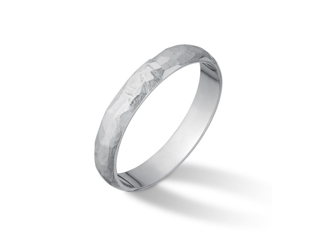 Tento snubní prsten z bílého zlata je oslavou drobných nedokonalostí, které tvoří dokonalý celek - stejně jako dva lidé ve vztahu, kteří k sobě přesně zapadnou. Ručně tepaný povrch vytváří jedinečnou hru světla a stínu, kde každý nepravidelný odlesk připomíná jeden společný okamžik, který stojí za to uchovat.