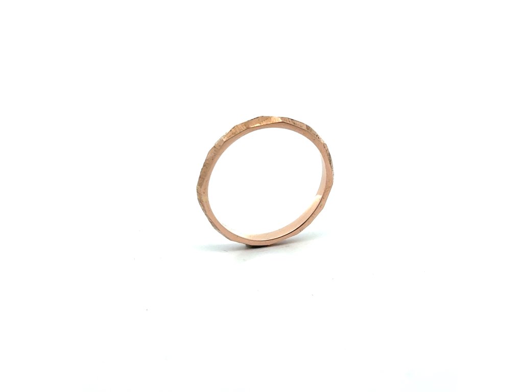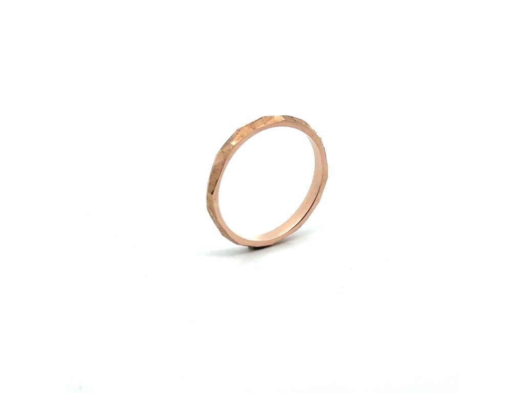 Tento snubní prsten z růžového zlata vznikl v rukou zlatníka, který mu vtiskl tvar, cit a osobnost. Každá ploška, každý lom světla vznikal poctivou ruční prací - pomalu, krok za krokem.